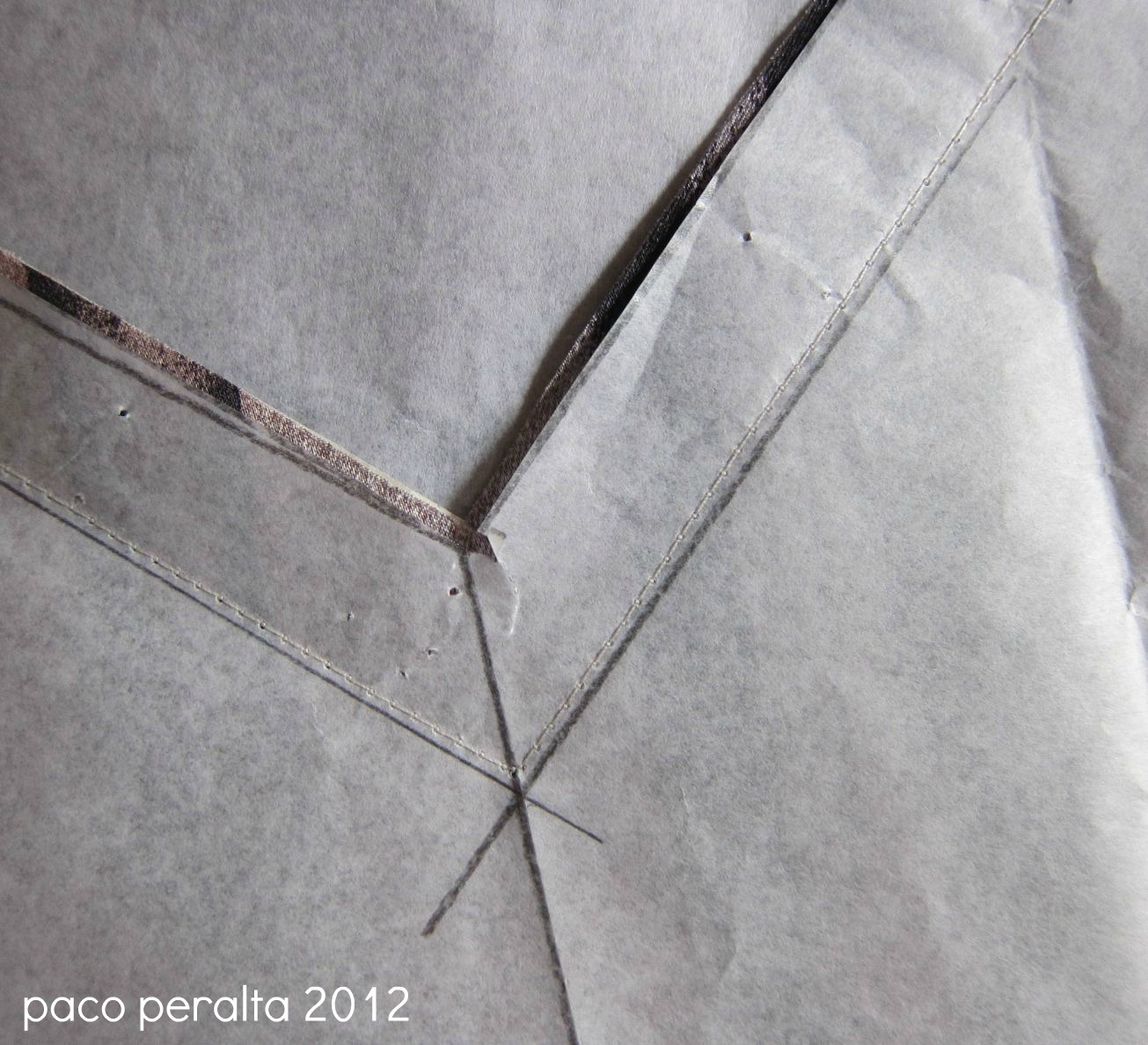 1).- Tenemos que cortar el satén de seda sobre una base estable que inmovilice el tejido. Como a su vez, reforzaremos el mismo con una "percalina" de organza de seda, el método más rápido y seguro para cortar las piezas es interponerlas entre dos hojas de papel, a modo de "bocadillo". Sujetamos bien las piezas del patrón con alfileres y procedemos a cortar por sus contornos, cortando de una sola vez el papel de base, la organza y el satén.