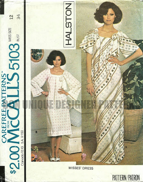 McCall´s 5103 from 1976. Lined dress in two lengths has raglan sleeves; stay is drawn thru neckline casing and bow is tacked. Long sleeves are 1" shorter than regular length.